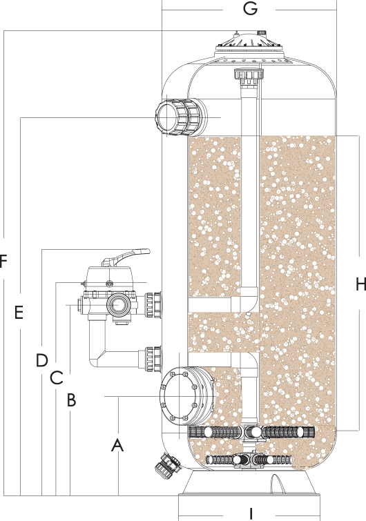Технические характеристики Назначение: домашние бассейны, коммерческие бассейны, глубокая фильтрация Тип фильтра: песочный Корпус фильтра: стекловолокно и резина Макс. объем обслуживаемого бассейна: 61 000 л Макс. пропускная способность: 15.2 м³/ч Максимальное рабочее давление: 250 kPa/36 psi/2.5 бар Загрузка песка: 580 кг Фракция песка: 0.5 - 0.8 мм Тип подключения: боковое Соединение 63 мм