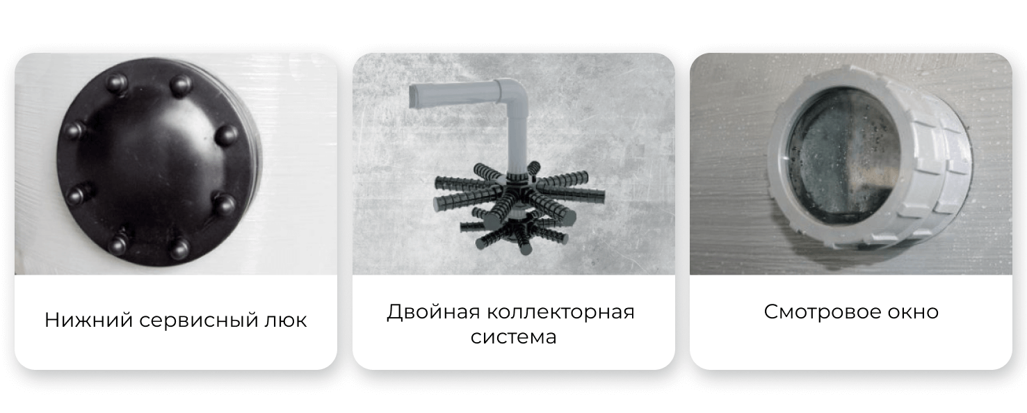 Дополнительно Стекловолокно и резина (антикоррозийный материал) Смотровое окно диаметром 4 дюйма Сервисный люк диаметром 158 мм Дренажное отверстие диаметром 2 дюйма Двухуровневые дюзы Максимальная скорость фильтрации: 50 м³/ч/м² Защита от УФ-излучения позволяет длительно использовать изделие под прямыми солнечными лучами