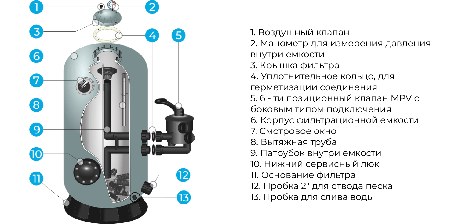Конструктивные особенности Фильтра Aquaviva SDB800-1 Корпус фильтрующей бочки выполнен из коррозионностойких материалов – полимер и стекловолокно. Стекловолоконная обмотка со специальной пропиткой защищает фильтр от UV-лучей и разрушительного влияния внешней среды. Емкость рассчитана на температуру жидкости до +43 С и давление в 2.5 Бар (постоянное рабочее). Модель оборудована дюзами, состоящими из двух уровней. Отличительной особенностью данной модели фильтра является наличие крупногабаритного смотрового отсека и бокового люка, используемого для обслуживания. Верхний люк используется для погрузки песка. Также фильтр снабжен отверстием для спуска воды и клапаном сброса воздуха.