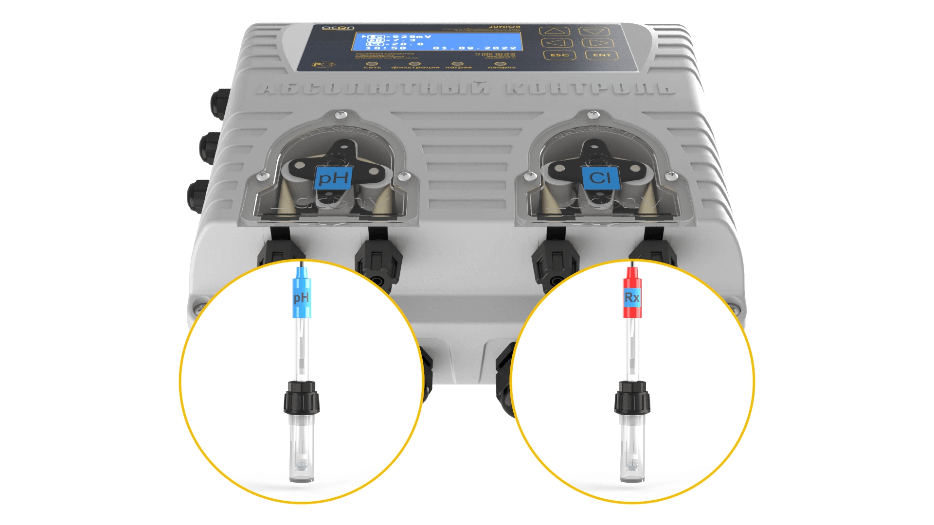 ДОЗИРОВАНИЕ И КОНТРОЛЬ: Три гальванически развязанных входа позволяют значительно увеличить точность измерений рH, Rx и Cl, и, соответственно, последующего контроля дозирования химических реагентов. Контроль состояния датчиков pH, Rx и Cl. Станция по специальному алгоритму каждый цикл дозирования анализирует показания с датчиков-электродов и в случае отсутствия отклика на дозирование отправляет уведомление о необходимости проверки состояния датчиков и последующей их калибровки. Автоматическая чистка амперометрического датчика свободного хлора. Подавая напряжение на датчик-электрод, станция в автоматическом режиме производит очистку медного основания от окислений. Данная функция позволяет значительно продлить срок службы датчика и свести к минимум необходимость его обслуживания. Высокоточный алгоритм адаптивной логики дозирования любых видов химии для воды плавательного бассейна позволяет добиться наилучших параметров, поддерживая необходимую концентрацию химии в воде с точностью до 0.01 ед.