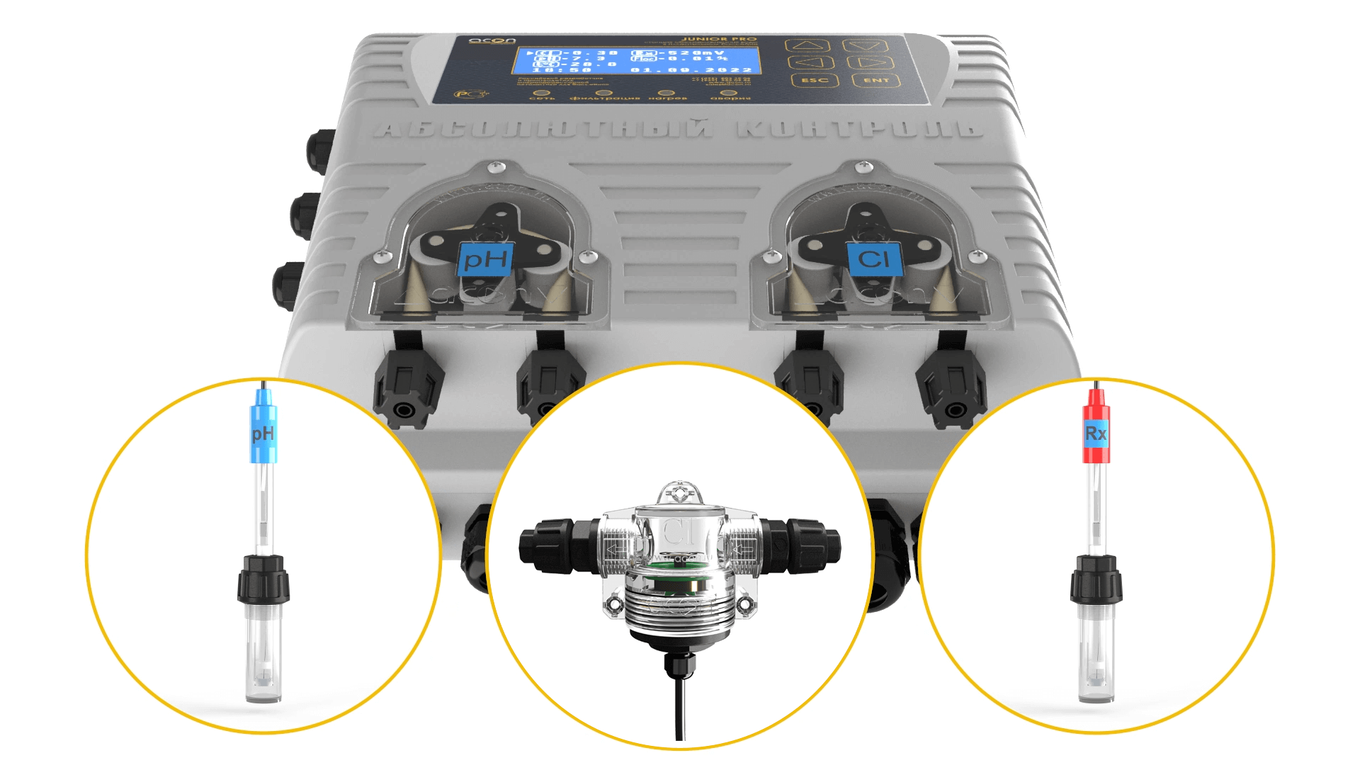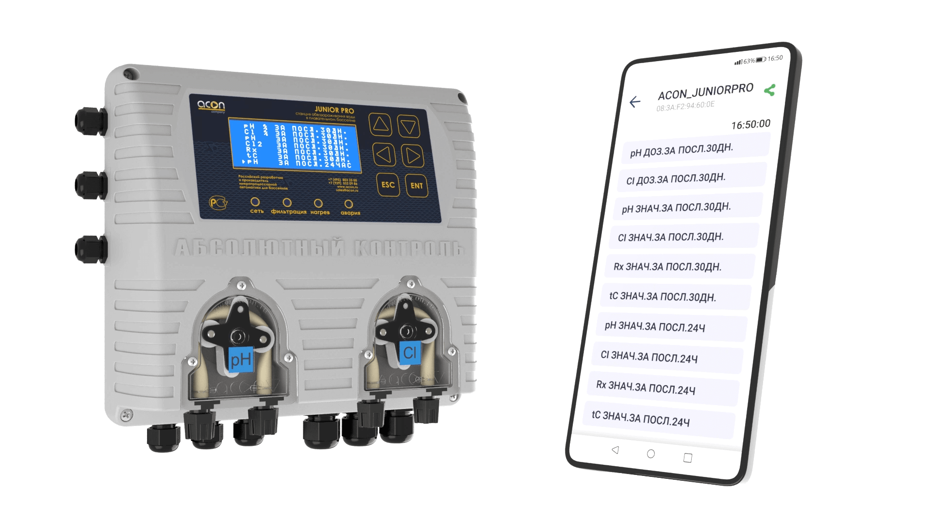 КОМПЛЕКТАЦИЯ: Станция укомплектована всем необходимым для монтажа и работы: - Электронный блок управления JUNIOR PRO - 1шт. - Перистальтический насос ACON ПРМ-2 1.5 л/ч - 1 шт. - Датчик-электрод рН - 1шт. - Датчик-электрод Rx - 1шт. - Амперометрический датчик свободного хлора - 1шт. - Буферный раствор рН7 - 1шт. - Буферный раствор рН9 – 1шт. - Буферный раствор Rx 650mV – 1шт. - Трубка ПВХ 4*6мм (2м) – 4шт. - Заборный узел химреагентов на жесткой стойке с датчиком уровня ACON (ПВХ стойка 0.5м, кабель 2м) - 2шт. - Клапан впрыска удлиненный 1/2" ACON – 2шт. - Трубка ПВХ 10*14 мм (5 м) - 1шт. - Пробоотборная ячейка с регулятором потока (2 держ. электрода, 2 фитинга) - 1шт. - Седелка клеевая ПВХ 1/2"ВР-D50 - 5шт. - Краник 1/2"ВР-1/2"НP– 2шт. - Фитинг 1/2" НР-трубка D14мм – 5шт. - Колба-фильтр под засыпку 1/2" – 1шт. - Комплект к дозирующему насосу (всасывающий и подающий с клапанами) ACON - 1 шт. - Комплект для отбора проб воды: