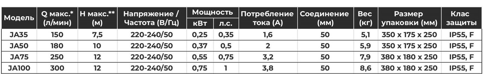 Пропускная способность насосов AquaViva серии JA Технические характеристики * Максимальная пропускная способность насоса ** Максимальная высота водяного столба